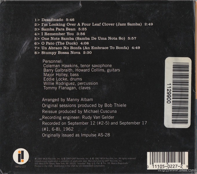 JAZZCD名称:Desafinado艺术家名称:Major Holley, Coleman Hawkins 发行公司:Impulse!发行编号:IMPD-227发行日期:1997年