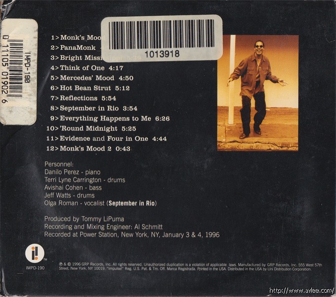 JAZZCD名称:Panamonk 艺术家名称:Danilo Perez发行公司:IMPULSE!发行编号:IMPD-190发行日期:1996年