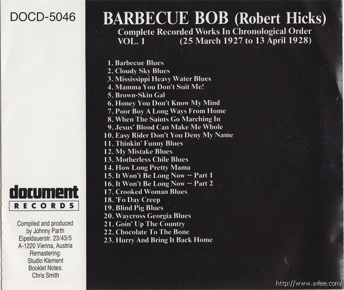 JAZZCD名称:Barbecue Bob Vol. 1 (1927 - 1928)艺术家名称:Barbecue Bob发行公司:DOCUMENT发行编号:DOCD-5046发行日期:1991年