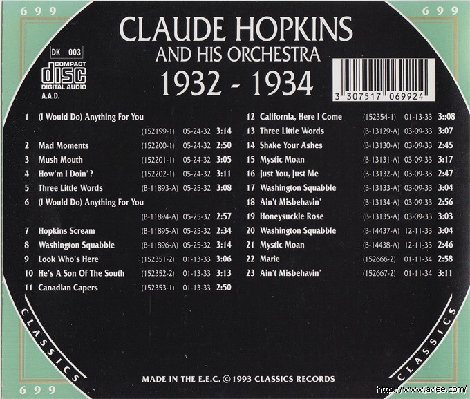 JAZZCD名称:Claude Hopkins 1932 1934 艺术家名称:Claude Hopkins发行公司:CLASSICS发行编号:699发行日期:1993年
