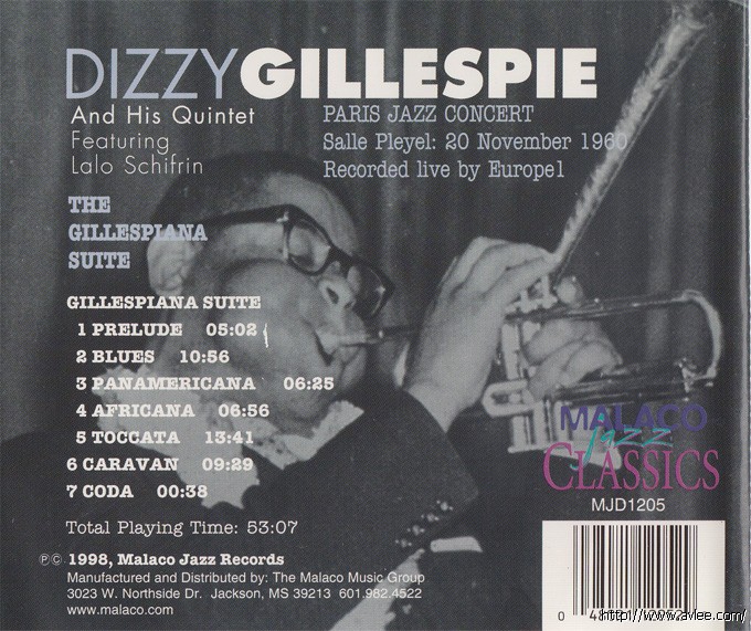 JAZZCD名称:Gillespiana Suite 艺术家名称:Dizzy Gillespie发行公司:MALACO JAZZ CLASSICS发行编号:MJD1205发行日期:1998年