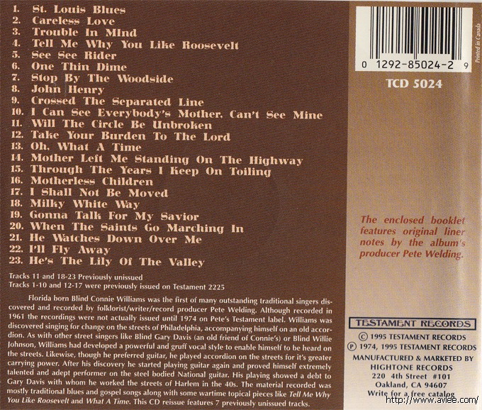 JAZZCD名称:Philadelphia Street Singer 艺术家名称:Blind Connie Williams发行公司:TESTAMENT发行编号:TCD 5024发行日期:1995年