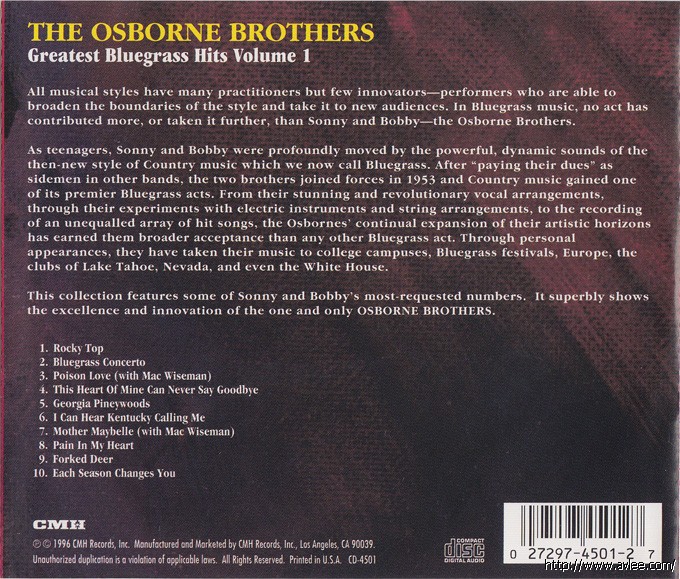 JAZZCD名称:Greatest Bluegrass Hits 艺术家名称:Osborne Brothers 发行公司:CME发行编号:CD-4501发行日期:1996年