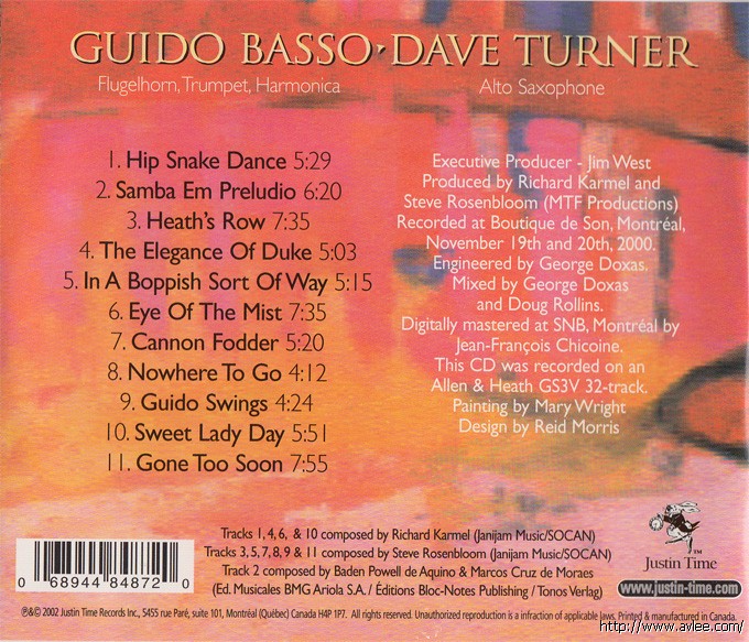 JAZZCD名称:Dedications 艺术家名称:Guido Basso / Dave Turner 发行公司:JUSTIN TIME 发行编号:JTR 8487-2 发行日期:2002年 唱片美图: