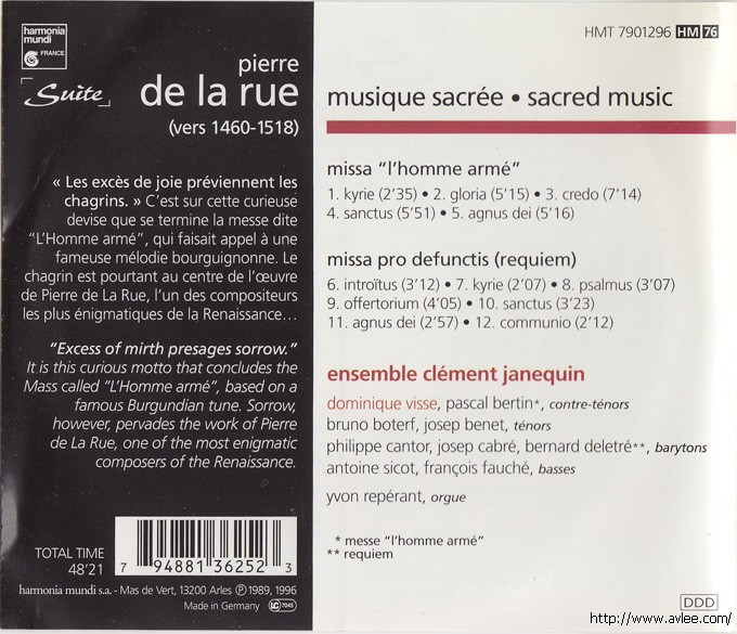 JAZZCD名称:Missa L'Homme Arme Missa Pro Defunctis 艺术家名称:Pierre de La Rue发行公司:HARMONIA MUNDI发行编号:HMT 7901296发行日期:1996年