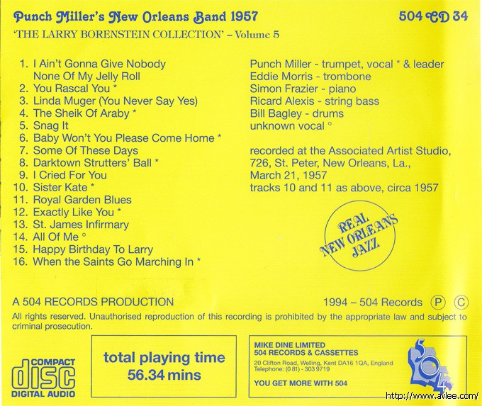 JAZZCD名称:The Larry Borenstein Collection Vol 5 艺术家名称:Punch Miller发行公司:504发行编号: CD 34发行日期:1993年