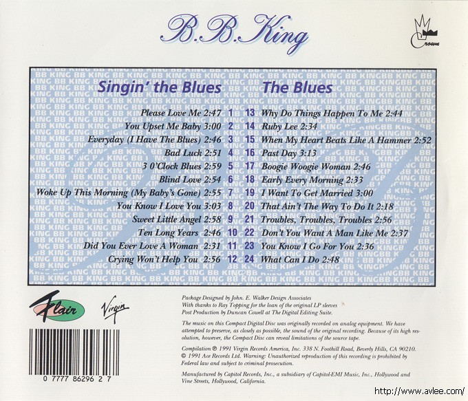 JAZZCD名称:Singing The Blues - The Blues 艺术家名称:B.B. King发行公司:ACE发行编号:V2-86296发行日期:1991年