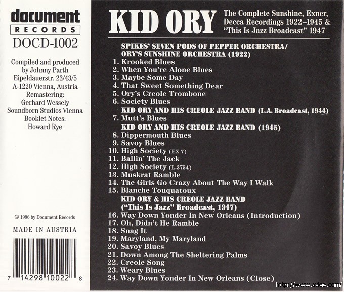 JAZZCD名称:Kid Ory 1922-1947 艺术家名称:Kid Ory发行公司:DOCUMENT发行编号:DOCD-1002发行日期:1996年