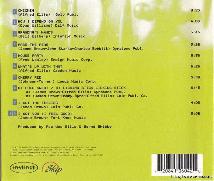 JAZZCD名称:Live & Funky 艺术家名称:Pee Wee Ellis发行公司:INSTINCT RECORDS发行编号:INS604-2发行日期:2002年