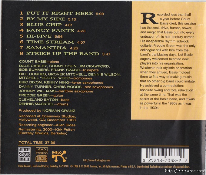 JAZZCD名称:Fancy Pan 艺术家名称:Count Basie发行公司:PABLO发行编号:OJCCD-1038-2发行日期:2000年