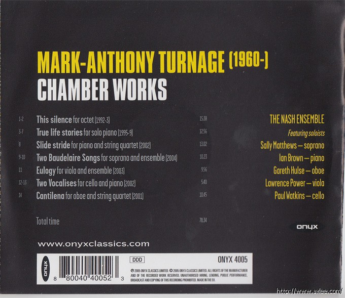JAZZCD名称:Turnage - This Silence艺术家名称:Lionel Friend & The Nash Ensemble发行公司:ONYX发行编号:ONYX 4005发行日期:2005年