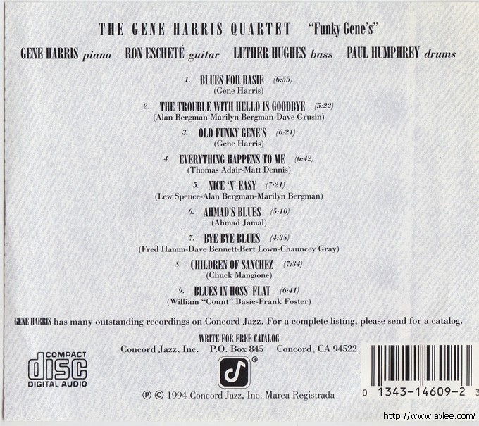 JAZZCD名称:Funky Gene's 艺术家名称:Gene Harris Quartet / Gene Harris 发行公司:CONCORD发行编号:CCD-4609发行日期:1994年