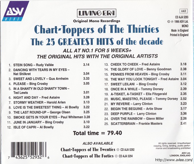 JAZZCD名称:Chart Toppers of the 30's 艺术家名称:Various Artists发行公司:ASV发行编号:CD AJA 5293发行日期:1998年