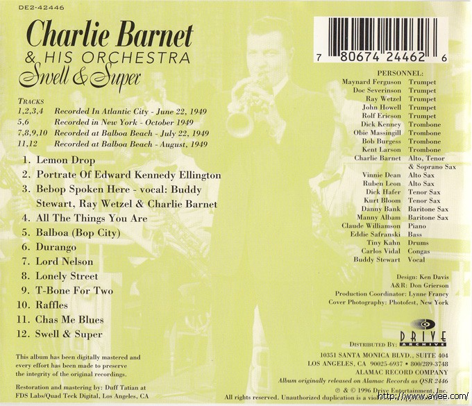 JAZZCD名称:Swell & Super 艺术家名称:Charlie Barnet 发行公司:DRIVE ARCHIVE 发行编号:DE2-42446 发行日期:1996年 唱片美图: