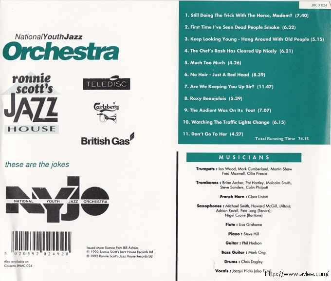 JAZZCD名称:These Are the Jokes 艺术家名称:National Youth Jazz Orchestra 发行公司:RONNIE SCOTT'S JAZZ HOUSE发行编号:JHCD 024发行日期:1992年
