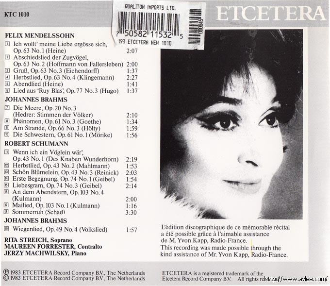 JAZZCD名称:Rita Streich & Maureen Forrester : duos 艺术家名称:Rita Streich; Maureen Forrester; Jerzy Machwilsky发行公司:ETCETERA 发行编号:KTC 1010发行日期:1983年