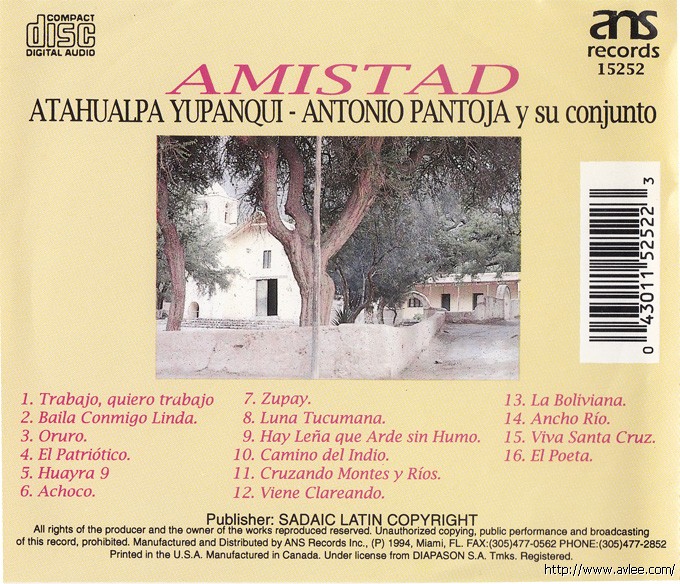 JAZZCD名称:AMISTAD ATAHUALPA YUPANQUI ANTONIO PANTOJA Y SU CONJUNTO发行公司:ANS 发行编号:ANS 15252-2发行日期:1994年