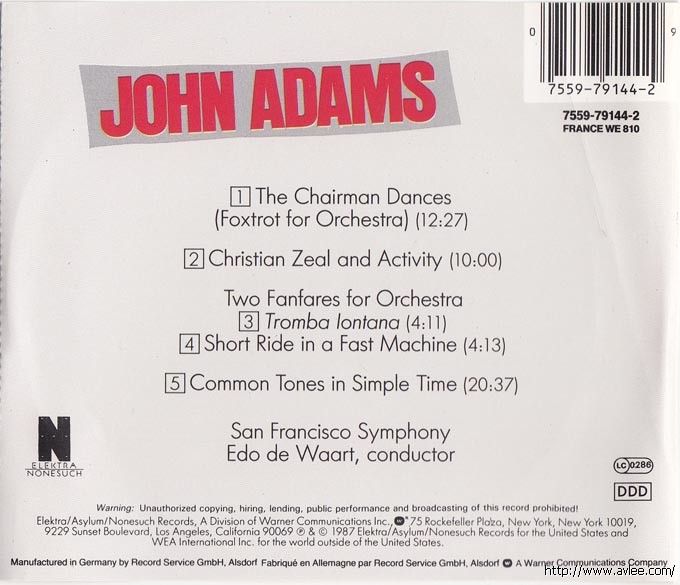JAZZCD名称:The Chairman Dances 艺术家名称:John Adams发行公司:ELEKTRA/NONESUCN DIGITAL发行编号:7559-79144-2发行日期:1987年
