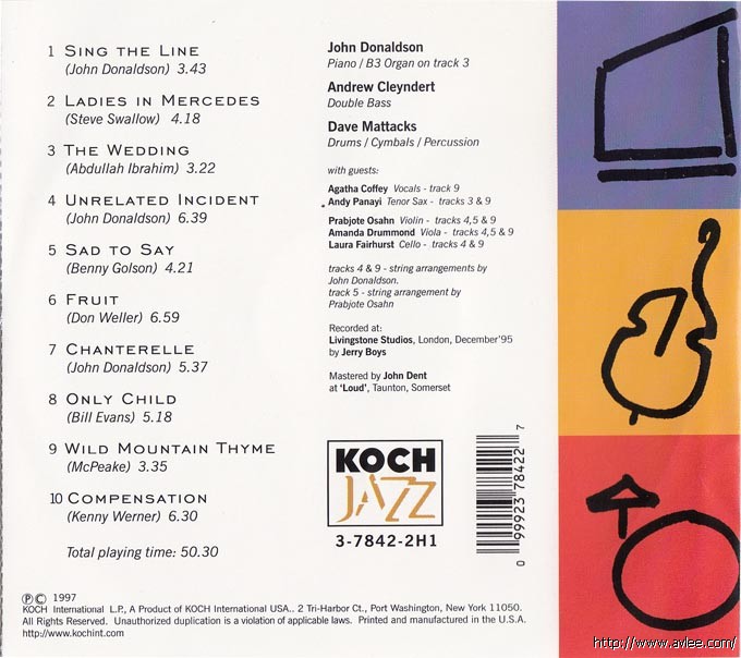 JAZZCD名称:Sing The Line 艺术家名称:John Donaldson/Andrew Cleyndert/Dave Mattacks 发行公司:KOCH JAZZ发行编号:3-7842-2H1发行日期:1997年