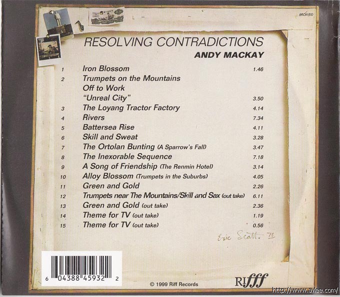 JAZZCD名称:Resolving Contradictions 艺术家名称:Andy MacKay发行公司:RIFFF发行编号:CD 001发行日期:1999年