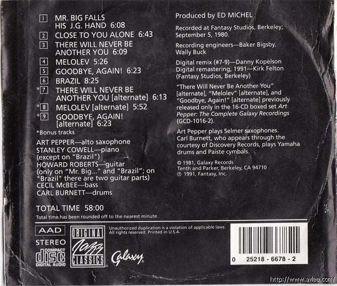 JAZZCD名称:One September Afternoon 艺术家名称:Art Pepper 发行公司:GALAXY发行编号:OJCCD-678-2发行日期:1991年