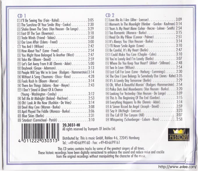 JAZZCD名称:I'll Be Seeing You 艺术家名称:Frank Sinatra发行公司:HISTORY发行编号:20.3030-HI发行日期:2004年