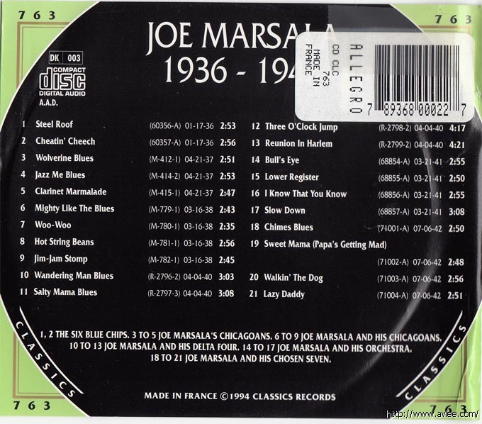 唱片曲目: 1. Steel Roof 2. Cheatin' Cheech 3. Wolverine Blues 4. Jazz Me Blues 5. Clarinet Marmalade 6. Mighty Like The Blues 7. Woo-Woo 8. Hot String Beans 9. Jim-Jam Stomp 10. Wandering Man Blues 11. Salty Mama Blues 12. Three O'Clock Blues 13. Reunion In Harlem 14. Bull's Eye 15. Lower Register 16. I Know That You Know 17. Slow Down 18. Chimes Blues 19. Sweet Mama (Papa's Getting Mad) 20. Walkin' The Dog 21. Lazy Daddy