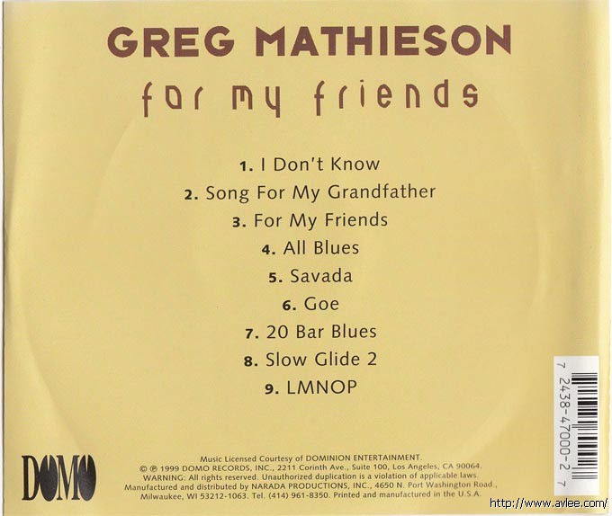 JAZZCD名称:For My Friends 艺术家名称:Greg Mathieson 发行公司:DOMO发行编号:72438-47000-2-7发行日期:1999年