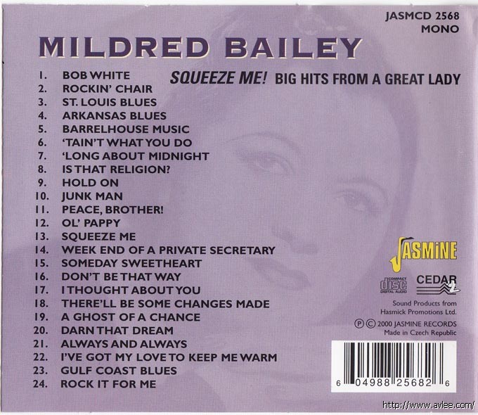 JAZZCD名称:Squeeze Me: Big Hits from a Great Lady 艺术家名称:Mildred Bailey 发行公司:JASMINE发行编号:JASMCD 2568发行日期:2000年