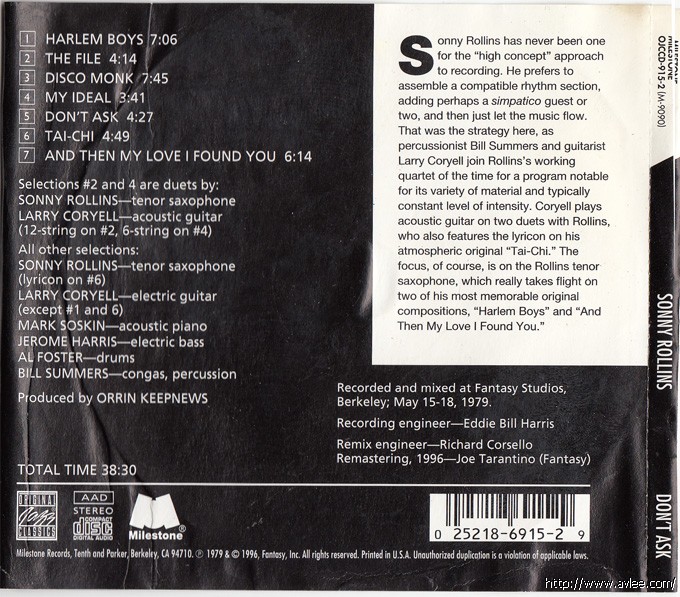 JAZZCD名称:Don't Ask艺术家名称:Sonny Rollins 发行公司:MILESTONE发行编号:OJCCD-915-2发行日期:1996年