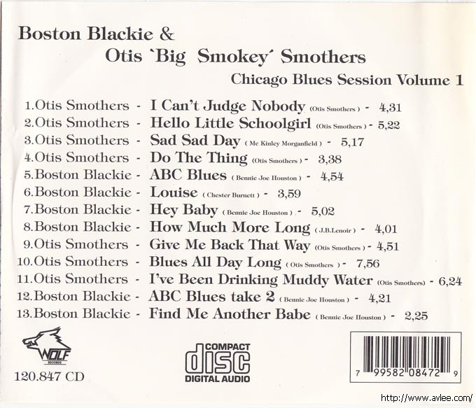 JAZZCD名称:Chicago Blues Session Volume 1 艺术家名称:Boston Blackie & Otis "Big Smokey" Smothers 发行公司:Wolf Records 发行编号:120.847 CD发行日期:1998年