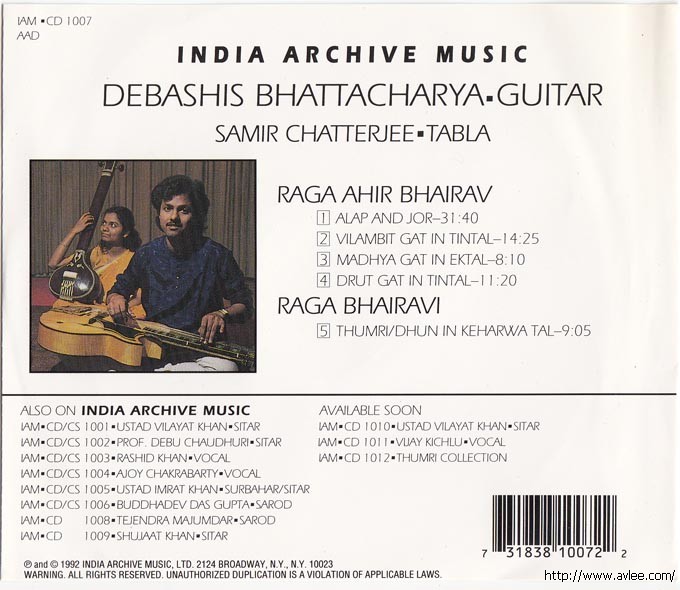 JAZZCD名称:Ahir Bhairav & Bhairavi 艺术家名称:Debashish Bhattacharya 发行公司:INDIA ARCHIVE MUSIC发行编号:IAM CD 1007发行日期:1992年