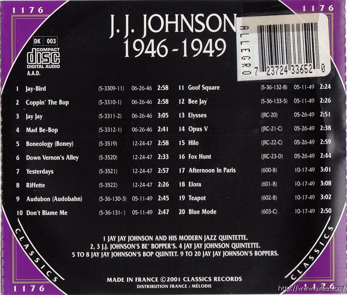 唱片曲目: 1. Jay-Bird - Jay Jay Johnson And His Modern Jazz Quintette 2. Coppin' The Bop - J.J. Johnson's Be' Boppers 3. Jay Jay - J.J. Johnson's Be' Boppers 4. Mad Be-Bop - Jay Jay Johnson Quintette 5. Boneology (Boney) - Jay Jay Johnson's Bop Quintet 6. Down Vernon's Alley - Jay Jay Johnson's Bop Quintet 7. Yesterdays - Jay Jay Johnson's Bop Quintet 8. Riffette - Jay Jay Johnson's Bop Quintet 9. Audubon (Audobahn) 10. Don't Blame Me 11. Goof Square 12. Bee Jay 13. Elysses 14. Opus V 15. Hilo 16. Fox Hunt 17. Afternoon In Paris 18. Elora 19. Teapot 20. Blue Mode