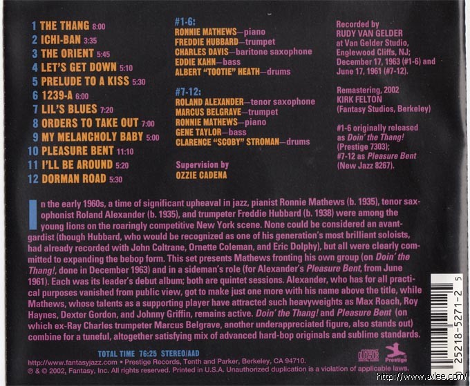 JAZZCD名称:Ronnie Mathews/Roland Alexander/Freddie Hubbard艺术家名称:Ronnie Mathews/Roland Alexander/Freddie Hubbard发行公司:PRESTIGE发行编号:PRCD-24271-2 发行日期:2002年