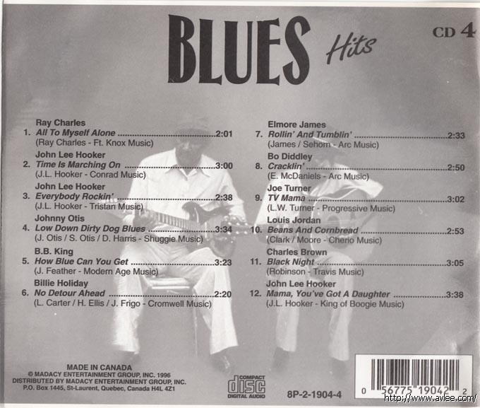 JAZZCD名称:The Blues Collection Blues Hits CD 4艺术家名称:Various Artists发行公司:DIGITAL STEREO发行编号:8P-2-1904-4发行日期:1996年