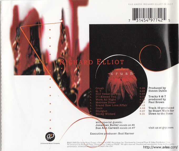 JAZZCD名称:Crush艺术家名称:Richard Elliot 发行公司:Verve Records发行编号:314 549 774-2发行日期:2001年