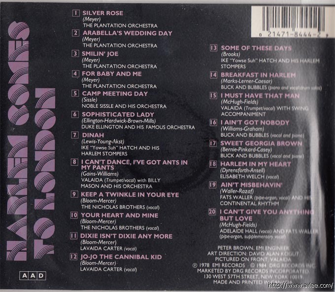 JAZZCD名称:Harlem Comes To London艺术家名称:Various Artists发行公司:EMI发行编号:8444发行日期:1984年