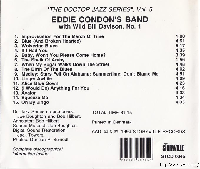 JAZZCD名称:The Dr. Jazz Series, Vol. 5艺术家名称:Eddie Condon发行公司:STORYVILE发行编号:STCD 6045发行日期:1994年