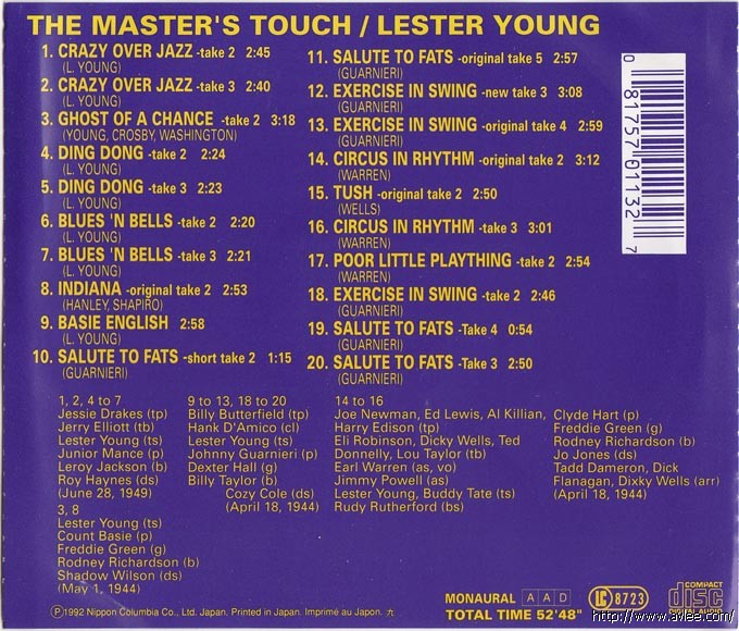 JAZZCD名称:Master's Touch 艺术家名称:Lester Young 发行公司:AAD 发行编号:SV-0113 发行日期:1992年 唱片美图: