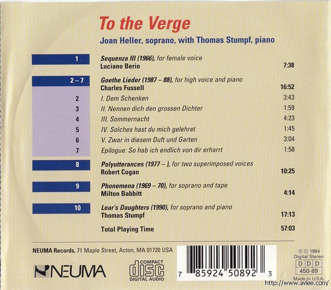 JAZZCD名称:To the Verge 艺术家名称:Joan Heller发行公司:NEUMA发行编号:NEUMA 450-89发行日期:1994年