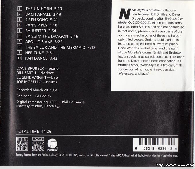 JAZZCD名称: Near Myth 艺术家名称:Dave Brubeck Quartet 发行公司:FANTASY 发行编号:OJCCD-236-2 发行日期:1995年 唱片美图: