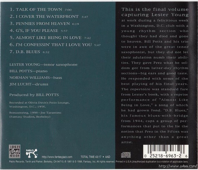 JAZZCD名称:In Washington D.C., 1956 Volume 4艺术家名称:Lester Young发行公司:PABLO发行编号:OJCCD-963-2发行日期:1998年