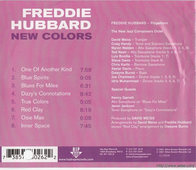 JAZZCD名称:New Colors 艺术家名称:Freddie Hubbard 发行公司:HIP BOP发行编号:HIBD 8026发行日期:2001年