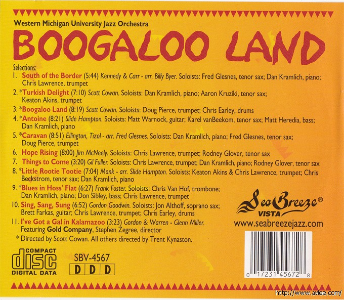 JAZZCD名称:Boogaloo Land 艺术家名称:Western Michigan University Jazz Orchestra 发行公司:SEA BREEZE VISTA 发行编号:SBV-4567 发行日期:2005年 唱片美图:
