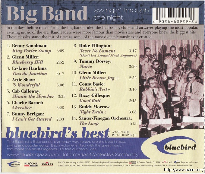 JAZZCD名称:Big Band: Swingin' Through the Night 艺术家名称:Various Artists 发行公司:BMG 发行编号:09026-63929-2 发行日期:2002年 唱片美图: