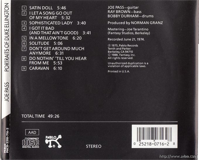 JAZZCD名称:Portraits of Duke Ellington 艺术家名称:Joe Pass发行公司:PABLO发行编号:PACD-2310-716-2发行日期:1988年