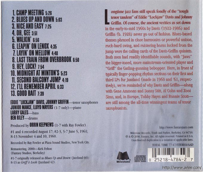 JAZZCD名称:Blues Up and Down 艺术家名称:Eddie "Lockjaw" Davis 发行公司:MILESTONE发行编号:MCD-47084-2发行日期:2000年