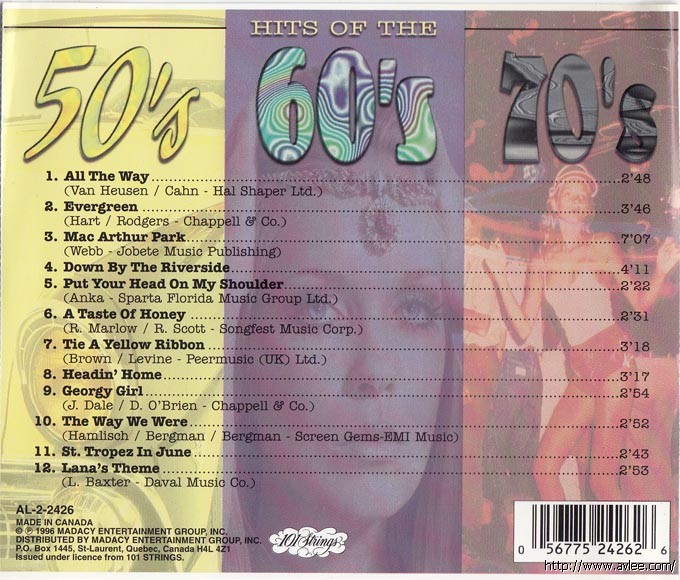 JAZZCD名称:Hits Of The 50's, 60's & 70's 艺术家名称:101 Strings 发行公司:DIGITAL STEREO发行编号:AL-2-2426发行日期:1996年