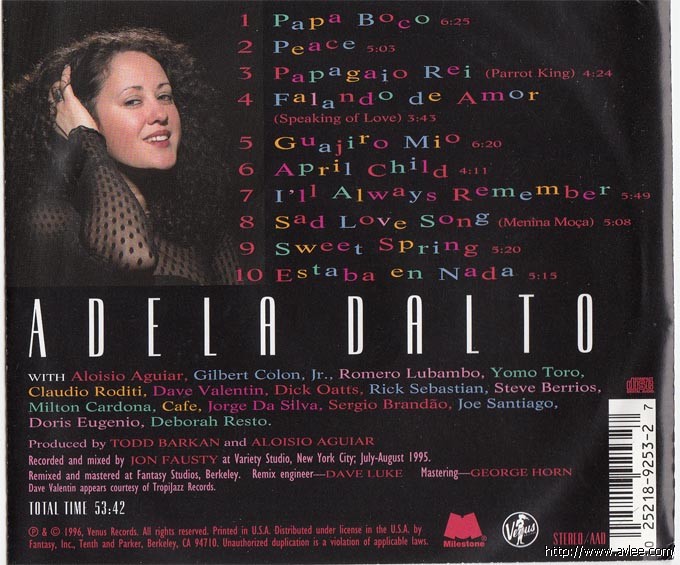 JAZZCD名称:Papa Boco 艺术家名称:Adela Dalto 发行公司:MILESTONE发行编号:MCD-9253-2发行日期:1996年