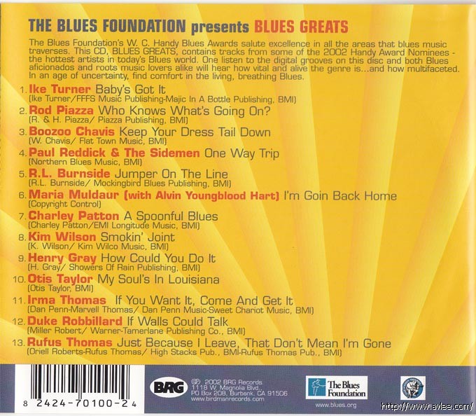 JAZZCD名称:THE BLUES FOUNDATION PRESENTS BLUES GREATS艺术家名称:Various Artists发行公司:BRG发行编号:010发行日期:2002年